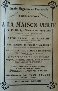 Au début du 20ème siècle, on vend des soieries, draperies, châles et cachemire à La Maison Verte, et même des uniformes pour les jeunes pensionnaires des environs de Chartres. Le complet en drap d’Elbeuf doublé en satin de chine est vendu 49 F, le pardessus en Taupeline 14,50 F, et les vendeuses distribuent gratuitement des images d’Épinal aux enfants qui accompagnent leurs parents pour leurs achats. L’ambiance du magasin est volontairement feutrée, les lumières indirectes, et si les visiteurs discutent dans les galeries c’est toujours à mi-voix.