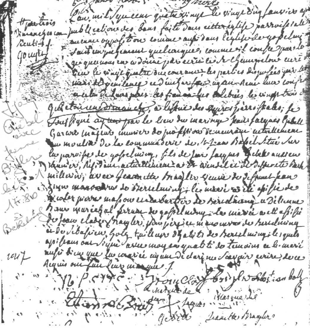 GEBELL Jean-Jacques, garçon meunier, demeurant actuellement au moulin de la Commanderie de Saint-Jean-de-Bassel, ban de Gosselming, fils de Jean-Jacques GEBEL, ancien meunier résidant actuellement à St. Wendel et de décédée MULLER Barbe