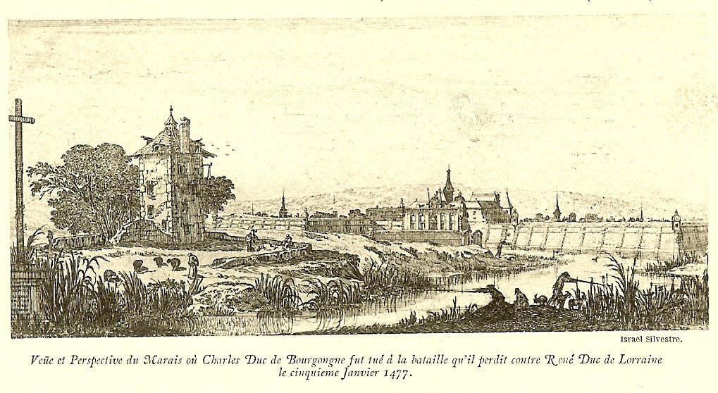 Le 5 Janvier 1477, il y a eu la bataille de Nancy. René II est vainqueur,Le Téméraire gît dans le Marais. Asséché, ce marais deviendra la Place de L’étang, ensuite place de la Croix de Bourgogne.